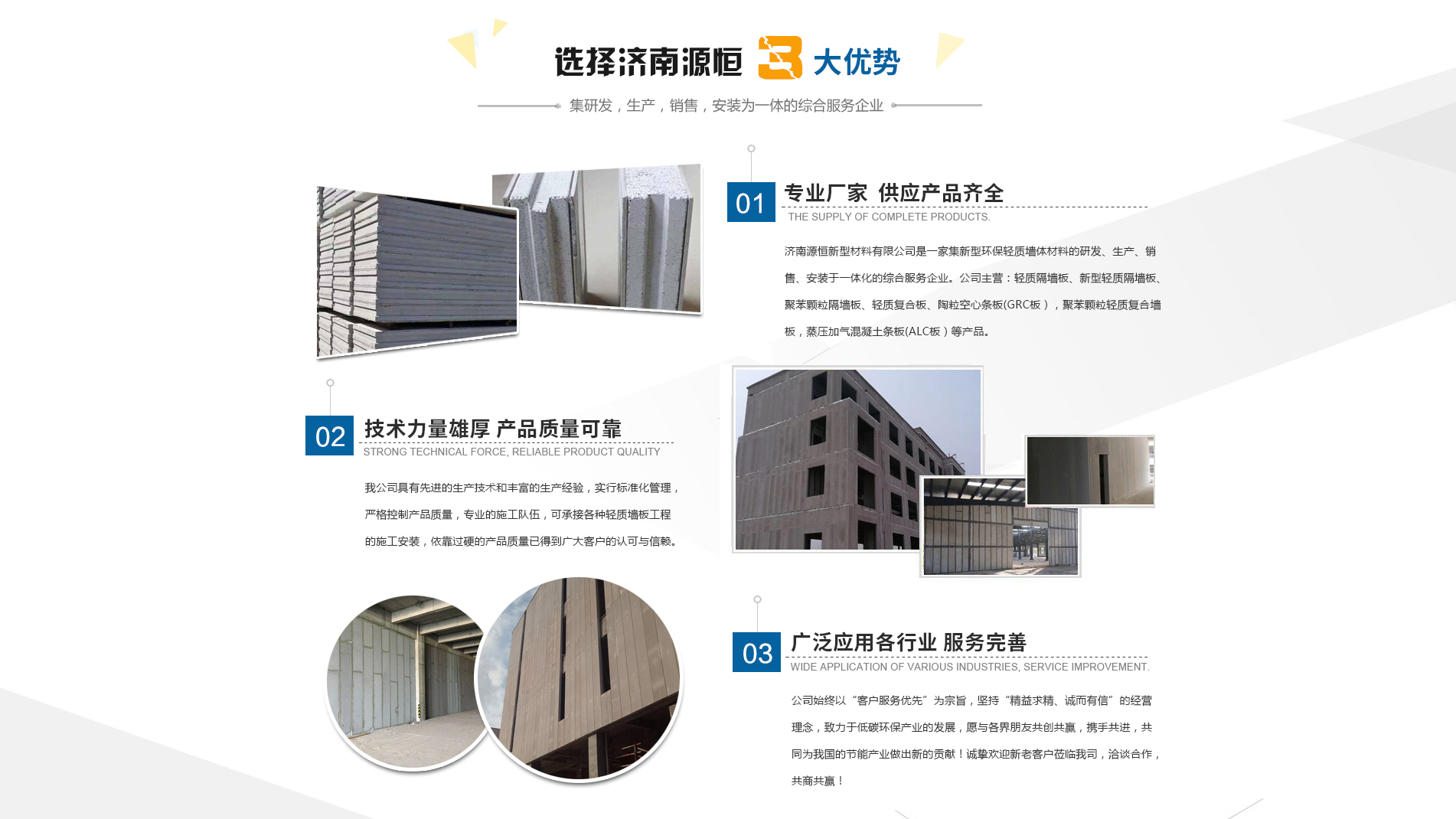 濟南源恒新型材料有限公司坐落于美麗的泉城濟南,是集新型環(huán)保輕質墻體材料的研發(fā)、生產、銷售、安裝于一體化的綜合服務企業(yè)。我公司具有的生產技術和豐富的生產經驗,為您提供輕質隔墻板、新型輕質隔墻板、聚苯顆粒隔墻板、輕質復合板、陶粒空心條板(GRC板),聚苯顆粒輕質復合墻板,蒸壓加氣混凝土條板(ALC板)等產品,本公司有專的施工隊伍,可承接各種輕質墻板工程的施工安裝。輕質隔墻板是國家推廣使用的新型輕質、綠色無害建材,是墻改節(jié)能政策大力扶持的環(huán)保節(jié)能產品,是發(fā)達國家普遍采用的新型墻體材料。濟南源恒新型材料有限公司實行標準化管理,嚴格控制產品質量,依靠過硬的產品質量已得到廣大客戶的認可與信賴。公司產品遍布各大城市,與國內多家客戶建立了良好的合作關系。公司始終以“客戶服務優(yōu)先”為宗旨,堅持“精益求精、誠而有信”的經營理念,致力于低碳環(huán)保產業(yè)的發(fā)展,愿與各界朋友共創(chuàng)共贏,攜手共進,共同為我國的節(jié)能產業(yè)做出新的...
